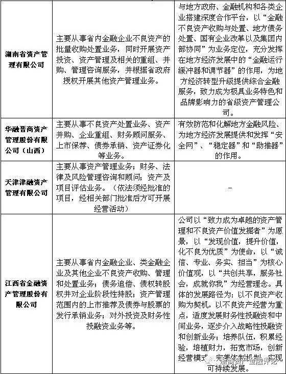 資產(chǎn)管理公司對不良資產(chǎn)的處置需要運用到多種手段,因此,開展相關(guān)業(yè)務(wù)輔佐不良資產(chǎn)的處置就顯得尤為重要。但由于各地方AMC的定位不同,其所開展的主要業(yè)務(wù)也有所差異,例如有些地方AMC將自身定位為地方不良資產(chǎn)的“收集器”,因此主要以收購不良資產(chǎn)業(yè)務(wù)為主;而有些地方AMC則側(cè)重于解決地方政府和國有企業(yè)的不良資產(chǎn)問題,在開展不良資產(chǎn)業(yè)務(wù)的同時還開展結(jié)構(gòu)化業(yè)務(wù);還有部分地方AMC以市場化的資金業(yè)務(wù)為主,將自身打造為地方綜合金融服務(wù)平臺。具體如下表所示:
