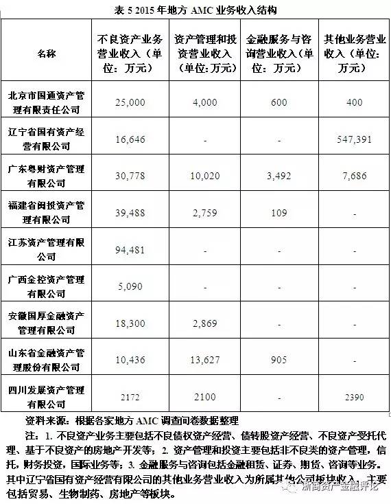 可以看到各地方AMC開展的業(yè)務(wù)種類繁多,除去最基本的不良資產(chǎn)處置業(yè)務(wù)外,多數(shù)地方AMC還選擇開設(shè)相關(guān)法律咨詢業(yè)務(wù)以及投資融資等業(yè)務(wù)。一方面,這是出于支撐不良資產(chǎn)處置業(yè)務(wù)的考慮;另一方面,開展其他金融服務(wù)業(yè)務(wù)能為自身帶來較高的收益。由于地方AMC所獲得的不良資產(chǎn)質(zhì)量相對較差,且處置方式受到較大的限制,導(dǎo)致不良資產(chǎn)業(yè)務(wù)收益不高(相對于四大AMC而言)。因此,多元化業(yè)務(wù)結(jié)構(gòu),滿足市場的潛在需求,從其他業(yè)務(wù)層面尋找利潤增長點成為了許多地方AMC的選擇。