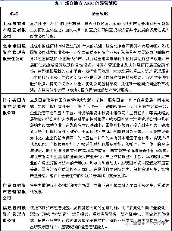 從整體上來看,地方AMC圍繞著不良資產(chǎn)處置這一基礎(chǔ)業(yè)務(wù)開展了多種相關(guān)業(yè)務(wù),通過設(shè)立基金、不良資產(chǎn)證券化、債轉(zhuǎn)股和并購重組等方式對不良資產(chǎn)處置鏈進行挖掘。而從業(yè)務(wù)拓展上升到戰(zhàn)略層面,各地方AMC也都在積極的整合當(dāng)?shù)刭Y源,與地方政府、銀行和其他金融機構(gòu)尋求合作,并根據(jù)地緣特征和相關(guān)的股東背景,發(fā)掘區(qū)域內(nèi)潛在的市場需求,開展“區(qū)域?qū)?rdquo;業(yè)務(wù),形成自身的業(yè)務(wù)特色。部分地方AMC的經(jīng)營戰(zhàn)略如表7所示。